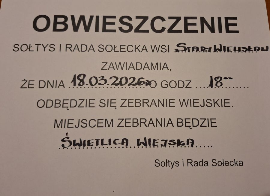 Sołtys i Rada Sołecka wsi Stary Wielisław zapraszają na zebranie wiejskie dnia 18 marca 2026r. o goz.18.00 w Świetlicy. Tematem zebrania będzie zmiana funduszu sołeckiego.
